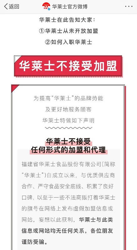 记者同时注意到,华莱士官网和官方微博上都在显著位置发表了声明,称公司从未委托任何网站进行加盟招商,并不对外开展加盟业务,并严打各地山寨华莱士。12月6日,新京报记者按照天眼查APP上显示的电话致电华莱士,接听者自称为华莱士负责招商联系人,“华莱士有直营店,也有加盟店,但具体门店数量并不清楚,因为我们属于第三方招商。”