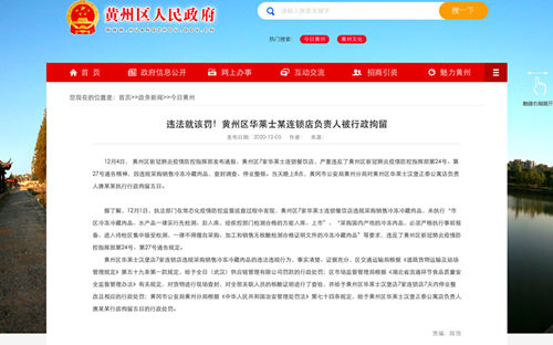 12月5日,黄州区人民政府官网公布了该事件的处罚情况,当地相关监管部门对货物进行现场查封,对全部关联人员的核酸证明进行查验,责令黄州区华莱士7家连锁店7天内停业整改。此外,黄州区华莱士汉堡正泰公寓店负责人唐某某被行政拘留5日,全日(武汉)供应链管理有限公司受到罚款的行政处罚。
