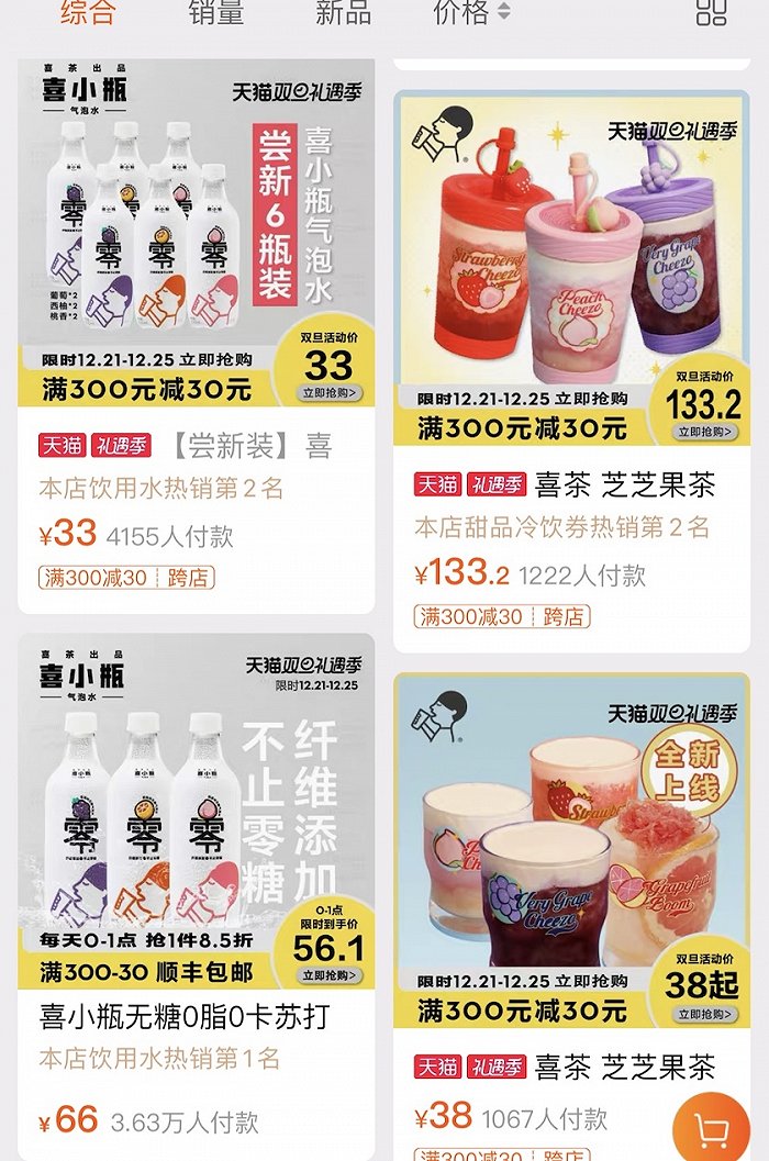 奈雪气泡水首次亮相,仅在天猫店内发售,没有拓展其他线下渠道。但喜茶推出气泡水产品时,除了在线下门店、小程序以及天猫旗舰店发售外,还进入了此前少有新式茶饮品牌涉足的便利店和超商渠道。当时业界有不少声音认为,这是要与元气森林争夺市场份额。