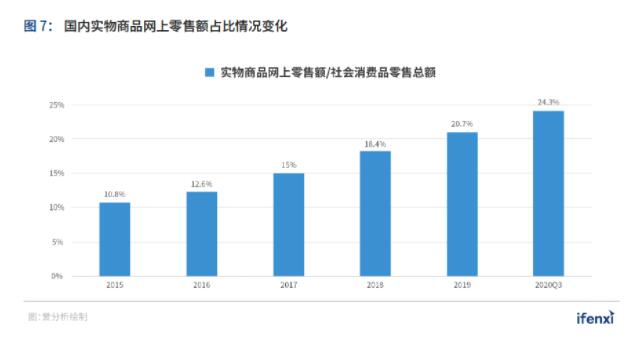 随着互联网渗透率的提高和消费者习惯的变化,消费线上化、全渠道化趋势不断加深。根据国家统计局数据,2019年实物商品网上零售额在社会消费品零售总额的占比不断攀升,达20.7%,在疫情期间增长至24.3%,消费线上化渗透加速。
