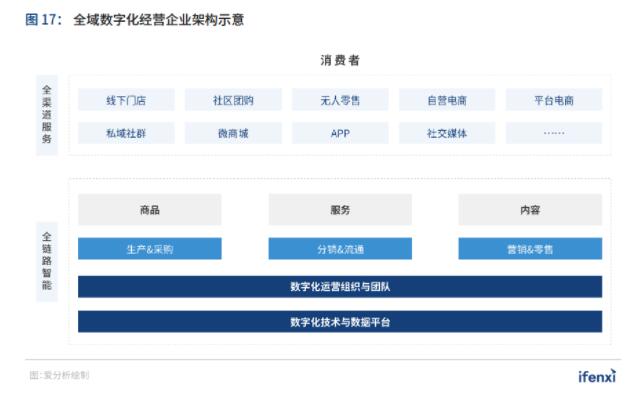 · 未来数字化的企业形态将走向全域数字化经营,即为消费者提供全渠道服务,同时搭建数字化技术与数据平台、加强数字化运营管理能力,支撑企业实现全链路智能经营管理。