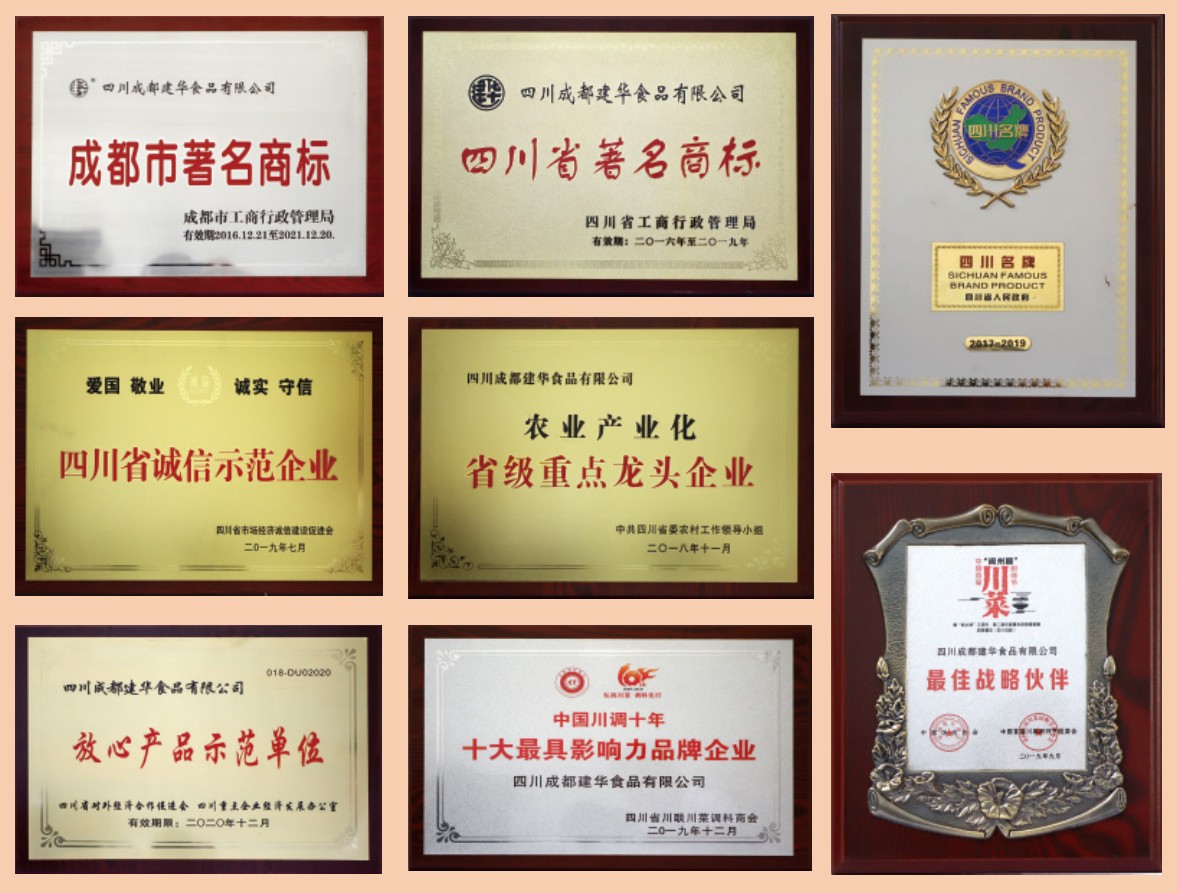 秉承“做食品·就是做人品”的企业发展理念,建华产品走进千家万户,深受广大消费者的喜爱,并先后荣获“四川名牌”“四川省著名商标”“产品质量AA级信誉单位”“省级农业产业化重点龙头企业”“全国文明单位”等荣誉,成为行业标杆企业。