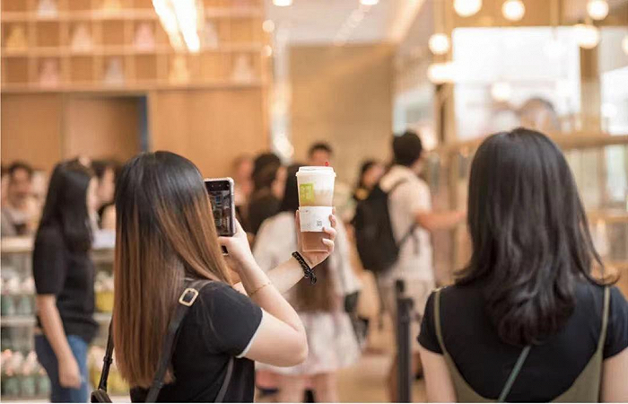 其次,消费者买一杯奶茶,已经不仅仅是买一杯产品,还有品牌的附加值、互动玩法、打卡功能。
