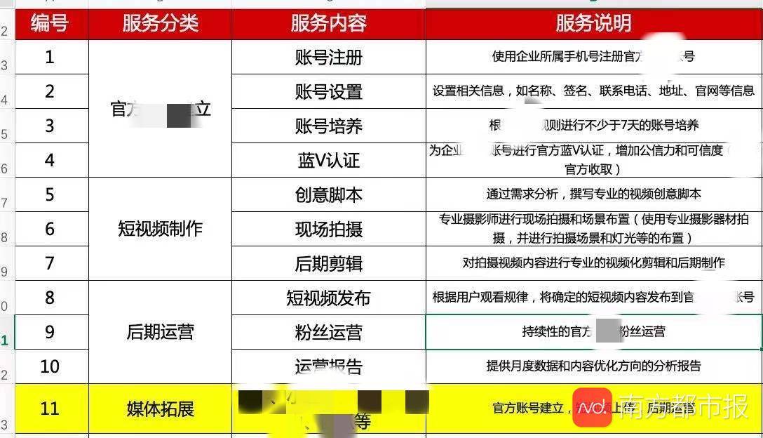 这类公司以小微企业为主,有的以短视频制作“招揽业务”,有的是专业的广告公司。位于北京的一家短视频营销公司发来的服务详情表格中,涉及到的服务包括账号建立、短视频制作、后期运营、媒体拓展。在短视频制作一栏中,服务内容包括撰写脚本、现场拍摄、后期剪辑,后期运营有短视频发布、粉丝运营等内容。