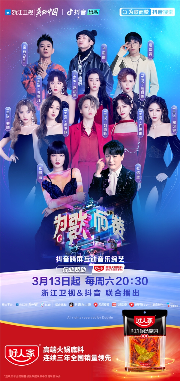 浙江卫视继《我爱记歌词》、《中国好声音》、《天赐的声音》等现象级音乐综艺爆款后,与抖音合力推出的创新性音乐综艺《为歌而赞》于3月13日首播,栏目阵容强大,模式新颖,台网联动,引发全民参与热潮。