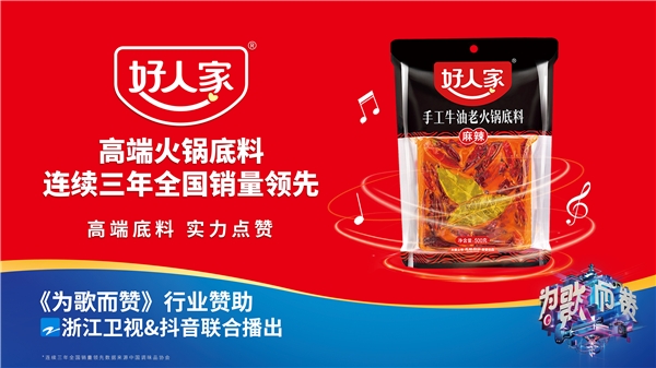 在浙江卫视与抖音跨屏联动创新玩法引发热潮的加持下,《为歌而赞》成为引领2021年的爆款音乐综艺IP,作为栏目行业赞助的,“好人家”借势成为社会关注焦点,为营销升级聚焦能量,再次推动“好人家高端火锅底料“的全国销售热潮。