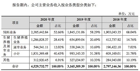 招股书显示,在该公司主营业务收入按业务类型分类中,占比最大的三块为饲料业务、生猪养殖及屠宰业务。其中饲料业务部分的营收占比最大,2018年至2020年占主营业务收入的比重分别为68.04%、58.29%、52.66%;生猪养殖及屠宰业务占比在上升,在2020年占主营业务收入的比重为40%。