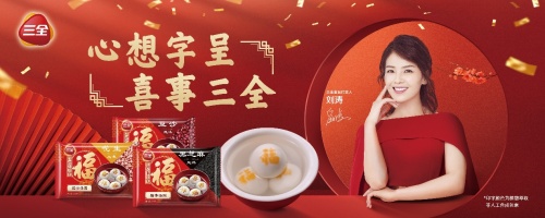 其二,福字汤圆以黑芝麻、花生、豆沙三大市场主流经典口味为基础而研制,优选糯米粉和馅料,由传统工艺匠心打造,将传统黑芝麻的香醇细腻、花生的醇厚甜蜜、豆沙甜而不腻的特色发挥的淋漓尽致,如此软糯香甜的美味口感和福字外观的创意特色,将给亿万国民带去更浓郁更有福气的年味记忆。从而进一步消费者强化认知——新年吃汤圆就选三全,吃三全就不能错过福字汤圆。再加上在明星代言人刘涛的公信力及三全自身强大的品牌力和优质的产品力加持下,福字汤圆层层渗透春节多维度的喜事场景触达家庭消费人群,立体化地打造出三全福字汤圆在国民消费人群中强大的影响力。